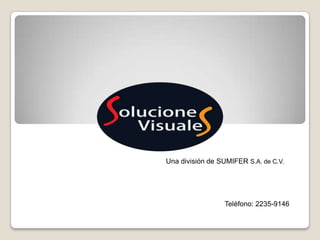 Este documento presenta una empresa que ofrece soluciones de mercadeo y publicidad como stands para eventos, escenarios, decoración, displays para puntos de venta y publicidad, kioscos, estructuras rotuladas e impresión de gran formato. La empresa busca diferenciar a sus clientes ofreciendo soluciones creativas. Cuenta con departamentos de diseño, sistema modular de aluminio, equipos de impresión y planta de producción. Algunos proyectos recientes incluyen stands para ferias, estructuras promocionales para cine y rotulación e