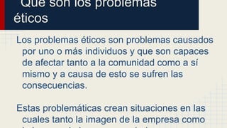 Este documento describe los problemas éticos comunes en las empresas como el abuso de poder, conflicto de intereses, soborno, lealtad excesiva y falta de compromiso. Explica cada problema ético y propone posibles soluciones como dar a los empleados tiempo para descansar sin abusar, y tener supervisores estrictos pero imparciales para prevenir problemas como el soborno o la lealtad excesiva.