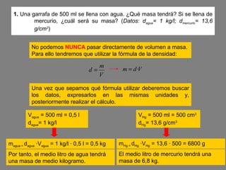 Este documento presenta varios ejercicios relacionados con el cálculo de masa, volumen y densidad utilizando las fórmulas correspondientes. Se resuelven ejercicios sobre el cálculo de la masa de agua y mercurio en una garrafa, la masa de agua en 50 ml, el volumen y masa de un lingote de oro, y más. En todos los casos se explican los pasos para expresar correctamente las unidades y realizar los cálculos.