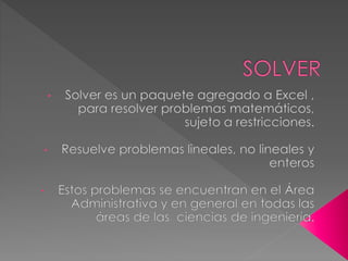 Solver permite encontrar combinaciones de variables que maximizan o minimizan una celda objetivo al trabajar con problemas que dependen de numerosas celdas, y también permite restricciones o conclusiones que deben existir para que la solución sea válida.