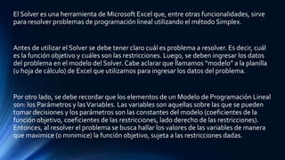 El Solver es una herramienta de Excel que resuelve problemas de programación lineal mediante el método Simplex. Para resolver un problema, se debe definir la función objetivo y las restricciones y luego ingresar los datos en una hoja de cálculo. Solver encuentra los valores óptimos de las variables cambiantes para maximizar u optimizar la función objetivo sujeta a las restricciones.