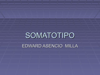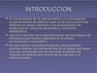 Este documento describe el somatotipo, un sistema para clasificar el tipo corporal de una persona basado en tres componentes: endomorfia, mesomorfia y ectomorfia. Explica cómo medir estas características antropométricamente y expresar el somatotipo de una persona a través de tres números. También incluye ejemplos de somatotipos comunes en diferentes deportes olímpicos.