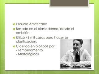 El documento describe la clasificación de William H. Sheldon de la personalidad basada en el somatotipo. Sheldon clasificó la personalidad en cuatro biotipos (endomorfo, mesomorfo, ectomorfo) dependiendo de la constitución física, y asoció cada biotipo a un temperamento particular (viscerotonía, somatotonía, cerebrotonía). Utilizó 46,000 casos para desarrollar esta clasificación de la personalidad basada en factores morfológicos y fisiológicos.