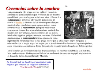 El documento habla sobre las creencias antiguas relacionadas con las sombras, incluyendo cómo los hombres de las cavernas descubrieron la importancia de las sombras proyectadas y cómo culturas como la egipcia y griega expresaban experiencias a través de sombras. También describe cómo la necromancia y esciamancia involucraban la evocación de sombras de muertos para adivinación, y cómo obras literarias como la Odisea, la Biblia y obras de Shakespeare presentan sombras de muertos.