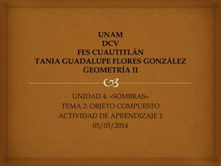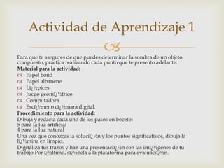 Este documento presenta una actividad de aprendizaje sobre sombras de objetos compuestos con luz artificial y natural. Proporciona instrucciones detalladas para dibujar las sombras de una persona en 5 pasos para cada tipo de luz, incluyendo la localización de puntos, trazado de proyectantes y sombreado final. El objetivo es que los estudiantes practiquen y aprendan a determinar correctamente las sombras de objetos compuestos.