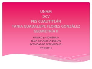 Este documento presenta instrucciones para dos actividades de aprendizaje sobre sombras en geometría. La primera actividad explica paso a paso cómo dibujar la sombra de un plano con declive sobre el suelo y cómo se vería proyectada sobre otro cuerpo, con 8 pasos. La segunda actividad explica cómo dibujar la sombra de un plano escalonado sobre el suelo a contra luz con 6 pasos. El objetivo es que los estudiantes dominen el método para obtener sombras sobre planos inclinados y escalonados.