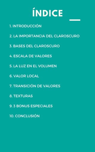 El documento es una guía práctica sobre el claroscuro escrita por Juan Sánchez, donde comparte sus experiencias como artista para ayudar a otros a mejorar sus habilidades de dibujo. A través de una estructura organizada, se abordan conceptos clave como la iluminación, la forma, los valores y las texturas, así como técnicas de sombreado efectivas para lograr resultados realistas. El autor enfatiza la importancia de la constancia, la paciencia y la aplicación de metodologías adecuadas en el proceso de aprendizaje artístico.