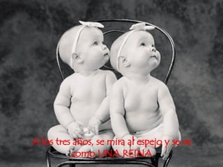 El documento describe la evolución de la percepción de una mujer sobre su apariencia a lo largo de las diferentes etapas de su vida, desde la infancia hasta la vejez. En la niñez se siente como una reina o princesa, pero en la adolescencia se vuelve más autocrítica. A medida que envejece, se vuelve menos preocupada por su apariencia y más segura de sí misma, hasta que en la vejez deja de preocuparse por el espejo y solo disfruta de la vida.
