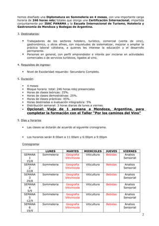 Este documento describe un programa de diplomado internacional en sommelería profesional de 4 meses de duración. El programa capacita a los estudiantes para trabajar como sommeliers en restaurantes u otros establecimientos, ayudando a los clientes a elegir vinos y sugiriendo maridajes apropiados. El programa incluye cursos sobre viticultura, geografía vitivinícola, vinificación, bebidas y análisis sensorial, así como prácticas profesionales. El objetivo es formar profesionales calificados para desarrollar