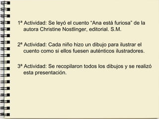 Se leyó el cuento 'Ana está furiosa' de Christine Nostlinger. Los niños realizaron dibujos para ilustrar la historia como verdaderos ilustradores. Los dibujos fueron recopilados y se presentó esta colección.