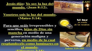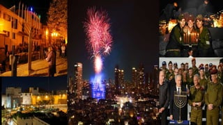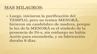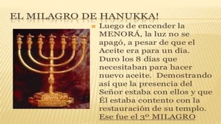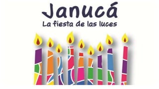El documento describe la fiesta judía de Janucá, también conocida como la Fiesta de la Dedicación o de las Luces. Se celebra durante 8 días en diciembre/enero para conmemorar la victoria judía sobre sus opresores y la purificación y rededicación del Templo en el 165 a.C. También hace referencia a Jesús en el Templo durante esta fiesta y describe cómo las velas de la janukia representan a Jesús como la luz verdadera que ilumina a la humanidad y llama a los creyentes a ser luz para el