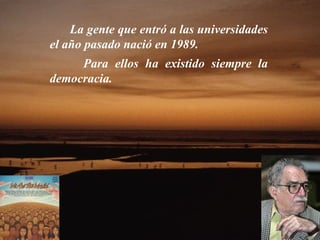 El documento describe cómo los jóvenes que ingresaron a la universidad el año pasado han crecido en un mundo muy diferente al de las generaciones mayores, debido a los cambios tecnológicos y políticos ocurridos en las últimas décadas. También enumera varios síntomas comunes de estar haciéndose mayor, como entender referencias culturales del pasado, preferir actividades más tranquilas y saber lo que se quiere en la vida.