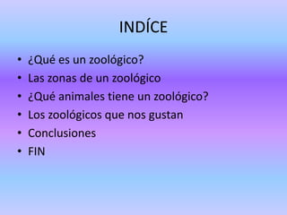 El documento presenta información sobre los zoológicos, incluyendo las diferentes zonas como tiendas de recuerdos y restaurantes, los diversos animales que se pueden encontrar como leones, jirafas y elefantes, y las opiniones de dos niñas de 4 años, Anas y Daniela, sobre un proyecto que hicieron sobre los zoológicos y su preferencia por el zoo de Cabárceno.