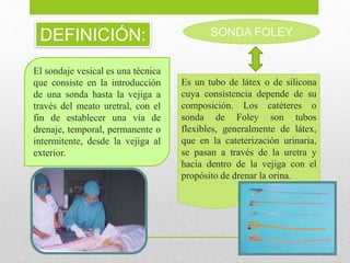 El sondaje vesical es una técnica mediante la cual se introduce una sonda flexible de látex o silicona a través del meato uretral hasta la vejiga para establecer un drenaje temporal o permanente de la orina. Las sondas de Foley son tubos flexibles que se pasan a través de la uretra hasta la vejiga para drenar la orina y se usan para facilitar la evacuación de la orina, identificar anomalías de la uretra y cuello vesical, y realizar tratamientos postquirúrgicos y lavados vesical