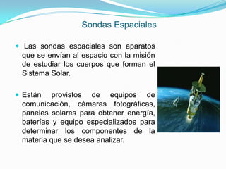 Este documento describe diferentes sondas espaciales utilizadas para explorar el Sistema Solar, incluyendo Mariner 9 que fue la primera en orbitar otro planeta, la sonda Rosetta que estudiará el cometa 67P/Churyumov-Gerasimenko en 2014, los rovers Spirit y Opportunity que exploraron Marte, la sonda Cassini-Huygens que estudió Saturno y sus lunas, y la sonda Voyager 1 que visitó Júpiter y Saturno y es el objeto más lejano creado por el hombre.