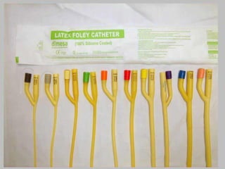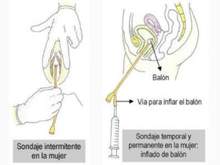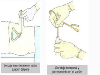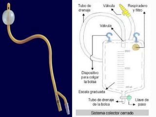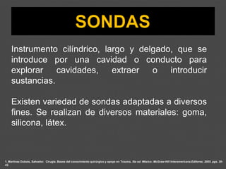 El documento describe varios tipos de sondas, cánulas y drenajes utilizados en medicina para explorar cavidades, extraer o introducir sustancias, y su clasificación según su uso y características. Se abordan aspectos como tamaños, material, y especificaciones para su correcta aplicación en distintas situaciones clínicas, enfatizando la importancia de la asepsia y el manejo seguro de estos dispositivos. Asimismo, se detallan los procedimientos y equipos necesarios para el sondaje vesical y otros tipos de drenaje.