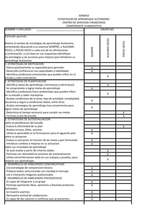 Este documento presenta un sondeo sobre estrategias de aprendizaje autónomo. El sondeo contiene preguntas sobre estrategias de motivación, planificación, autoevaluación, habilidades comunicativas y habilidades psicosociales. El estudiante responde a cada pregunta indicando si utiliza cada estrategia "siempre", "algunas veces" u "pocas veces". Al final, identifica las estrategias que necesita mejorar y las acciones específicas que tomará para fortalecer su aprendizaje autónomo, como fijarse más en