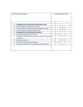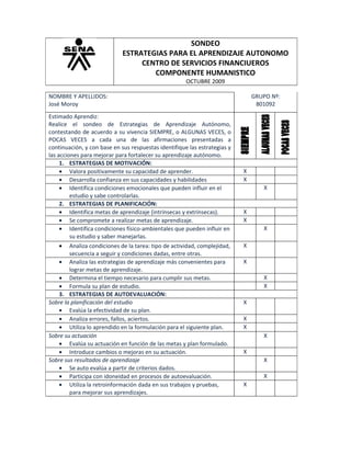 El documento presenta un sondeo sobre estrategias para el aprendizaje autónomo dirigido a José Moroy. El sondeo incluye preguntas sobre estrategias de motivación, planificación, autoevaluación, desarrollo de habilidades comunicativas y sociales. José Moroy respondió que utiliza siempre o algunas veces la mayoría de las estrategias propuestas. El sondeo concluye solicitando identificar estrategias a mejorar y acciones específicas para fortalecer su aprendizaje autónomo.