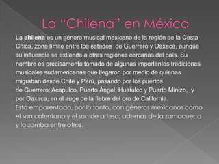 Este documento describe los antecedentes generales del son cubano y la chilena mexicana. Explica que el son cubano y el son montuno se originaron en Cuba e influenciaron los géneros musicales de otros países del Caribe. Luego, detalla que la chilena es un género de la región de Costa Chica en México que se deriva de tradiciones musicales sudamericanas y comparte características con la cueca chilena y los sones mexicanos. Finalmente, brinda detalles sobre la estructura, instrumentación y temática tí