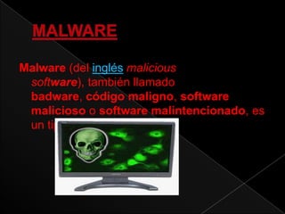 Este documento define y describe varios tipos de malware comunes como virus, phishing, spyware, adware, spam y firewalls. También explica cómo los antivirus han evolucionado para detectar y bloquear una variedad más amplia de amenazas, e introduce el programa AdwCleaner diseñado para eliminar software no deseado.