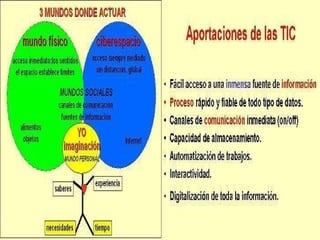 Este documento describe las tecnologías de la información y la comunicación (TIC), incluyendo su definición, contribuciones y desafíos. Las TIC agrupan elementos y técnicas para el procesamiento y transmisión de información, y son cruciales para la sociedad moderna, aunque su acceso sigue siendo limitado para algunos. Las TIC tienen un gran impacto en todas las áreas de la vida y la economía, pero también generan nuevas brechas digitales y dependencias tecnológicas.