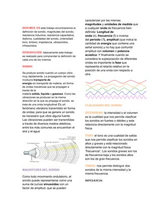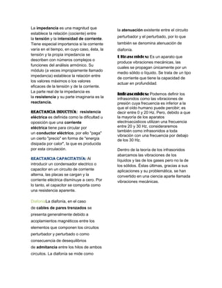 Este documento define conceptos clave relacionados con el sonido como ondas longitudinales, magnitudes como frecuencia, amplitud y fase. Explica cualidades del sonido como intensidad (volumen), tono (frecuencia) y timbre. También cubre conceptos como impedancia, reactancia inductiva y capacitativa, diafonía, ultrasonidos e infrasonidos.