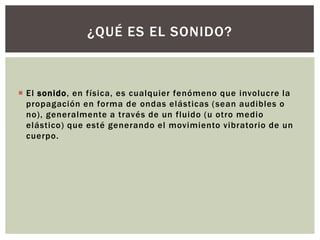 El sonido se define como la propagación de ondas elásticas a través de un medio, ya sea audibles o no. El sonido analógico representa la onda de sonido mediante variaciones de tensión eléctrica, mientras que el sonido digital codifica muestras numéricas de la onda de sonido. BPM se refiere a los pulsos o latidos por minuto de la música. El documento también menciona algunos programas populares para editar sonido.