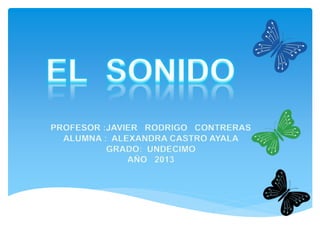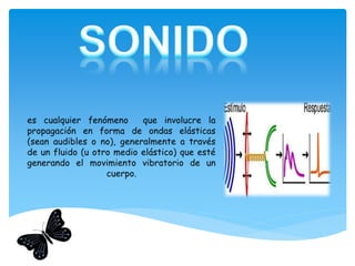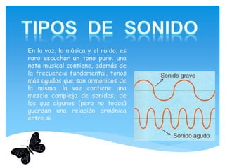 El sonido se produce por vibraciones que se transmiten en forma de ondas a través de un medio elástico como el aire, los líquidos o los sólidos. La velocidad del sonido depende de las características del medio, siendo mayor en los sólidos y menor en los gases. El sonido se puede caracterizar por su longitud de onda, frecuencia, amplitud y timbre.