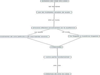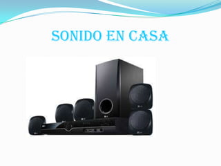 Este documento describe las características y funcionamiento de un sistema de sonido en casa. Explica que cuenta con altavoces, un sistema estéreo de 4 vías y Dolby para transiciones de canales. Detalla que se requieren 5 altavoces y un subwoofer ubicados estratégicamente para recrear el sonido 5.1 de películas. Además, presenta normas de uso como retrasar los canales de efectos a través de delays para que el sonido parezca proceder de la pantalla y no de los altavoces laterales.