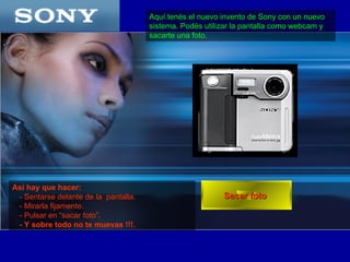 El documento describe cómo usar una pantalla como una cámara web para tomarse selfies, indicando que el usuario debe sentarse frente a la pantalla, mirar fija y pulsar un botón para sacar la foto. Luego, la pantalla muestra instrucciones para sonreír y moverse un poco a la izquierda para mejorar la foto, pero finalmente revela que todo era una broma ya que no es posible sacar una foto de esa manera.