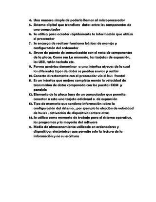 Este documento presenta un trabajo teórico sobre el hardware de computadoras. Contiene una sopa de letras con palabras relacionadas a las partes de una computadora y pistas para identificar cada palabra. Las pistas se refieren a elementos como la ranura para el microprocesador, las ranuras de expansión, el microprocesador, el bus de sistema y componentes como la memoria y tarjetas de expansión.