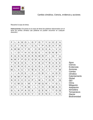 Este documento trata sobre el cambio climático, la ciencia detrás de él, la evidencia que lo demuestra y las acciones que se pueden tomar. Resuelve una sopa de letras con palabras clave relacionadas como ciencia, evidencias, acciones, cambio climático, calentamiento global y otros.