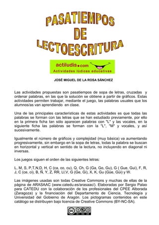 Las actividades propuestas incluyen pasatiempos como sopa de letras y crucigramas que permiten trabajar palabras usuales que los alumnos van aprendiendo en clase. Las actividades se enfocan en palabras formadas solo con las letras estudiadas previamente, aumentando progresivamente en complejidad y número de gráficos. Los juegos siguen el orden de aprendizaje de las letras del alfabeto español.
