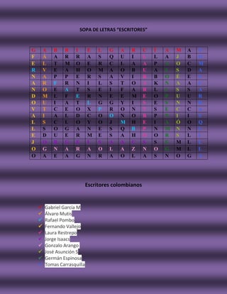 La sopa de letras contiene las letras de los apellidos y nombres de 10 escritores colombianos notables como Gabriel García Márquez, Álvaro Mutis, Rafael Pombo, Fernando Vallejo, Laura Restrepo, Jorge Isaacs, Gonzalo Arango, José Asunción Silva, Germán Espinosa y Tomas Carrasquilla.