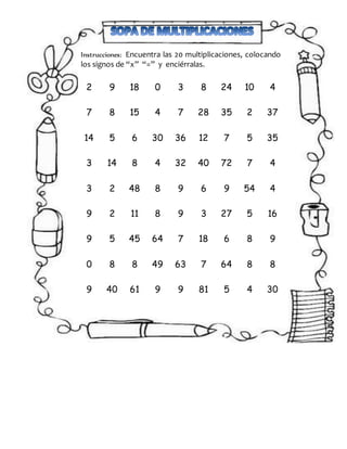 El documento contiene instrucciones para encontrar 24 y luego 20 multiplicaciones colocando los signos de multiplicación y igual entre los números dados. Las multiplicaciones están agrupadas en tablas sin encabezados ni explicaciones adicionales.