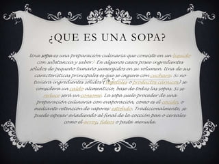 Este documento describe las sopas típicas de las diferentes regiones de Colombia. Presenta las sopas tradicionales de departamentos como Boyacá, Cundinamarca, Magdalena, Bolívar, Sucre, Cesar, Tolima, Huila, Santander, Norte de Santander, Valle del Cauca, Narino, Llanos Orientales, Amazonas, Arauca, Antioquia, Caldas, Chocó, Tumaco y Guapi. Algunas sopas populares mencionadas son el ajiaco bogotano, el cuchuco, el mute, el sancocho