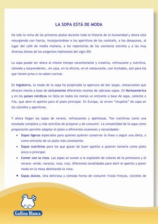 Este documento habla sobre las sopas más saludables y frescas para el verano. Presenta diferentes tipos de sopas frías como cremas, purés y sopas que se pueden preparar en verano, incluyendo recetas como ajo blanco, crema de aguacate, crema de calabacín y caldo de pollo. También destaca las ventajas nutricionales y de hidratación de las sopas para el verano.