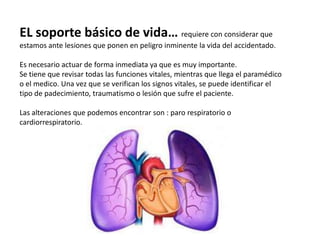 Este documento describe los procedimientos básicos de primeros auxilios para tratar una obstrucción total de las vías respiratorias. Esto incluye realizar compresiones abdominales rápidas con el puño para desalojar cualquier objeto extraño que esté bloqueando la respiración del paciente, repitiendo la maniobra de 6 a 10 veces hasta que se logre liberar la obstrucción. También se especifica que, en el caso de una mujer embarazada, las compresiones abdominales deben realizarse a la altura del apéndice xifo