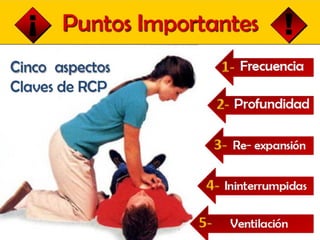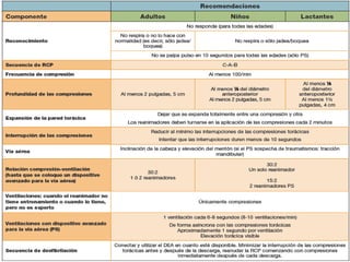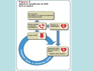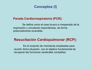 El documento detalla los conceptos fundamentales de la resucitación cardiopulmonar (RCP) y el soporte vital básico (SVB), enfatizando la importancia de las maniobras de RCP y la desfibrilación. Se describe el protocolo a seguir en caso de parada cardiorrespiratoria, incluyendo la secuencia de compresiones y ventilaciones, así como la utilización de desfibriladores. Además, se menciona la necesidad de educación pública y la respuesta rápida para mejorar las tasas de supervivencia en situaciones de emergencia.