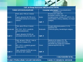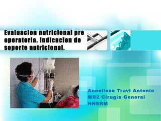 Este documento describe la evaluación nutricional preoperatoria de Annelisse Travi Antonio. Se discute la importancia de la desnutrición hospitalaria y cómo aumenta la morbilidad y mortalidad así como la estancia hospitalaria. Se proporciona una guía sobre cómo realizar una valoración nutricional completa del paciente que incluye parámetros clínicos, antropométricos y de laboratorio. Finalmente, se discuten las opciones de soporte nutricional enteral y parenteral según las necesidades del paciente.