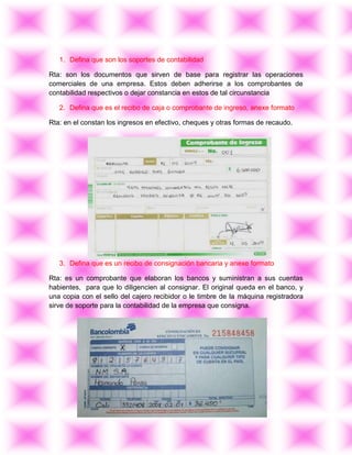 Este documento presenta una lista de 13 soportes contables comunes y define cada uno de ellos brevemente. Incluye formatos de ejemplo para algunos soportes como facturas, recibos de caja, cheques y pagarés. Finalmente, explica el procedimiento contable para elaborar un comprobante de contabilidad.