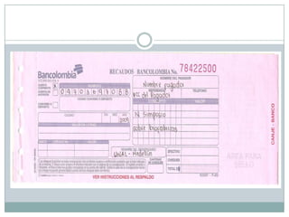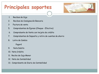 Los soportes contables son documentos que registran las operaciones comerciales de una empresa. Entre los principales soportes contables se encuentran recibos de caja, facturas de venta, comprobantes de egreso, letras de cambio y pagarés. Todos los soportes deben contener información como la razón social de la empresa, número, fecha y descripción del documento, así como firmas de los responsables.