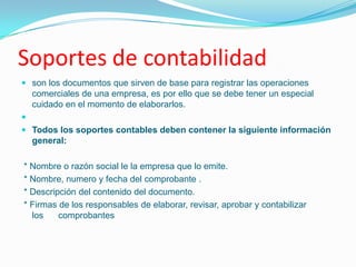 Los soportes contables son documentos que sirven de base para registrar las operaciones comerciales de una empresa. Algunos de los principales soportes contables son los recibos de caja, recibos de consignación bancaria, facturas de compraventa, comprobantes de egreso, letras de cambio y pagarés. Los soportes pueden ser externos o internos a la empresa y deben contener información general como el nombre de la empresa, número y fecha del comprobante.