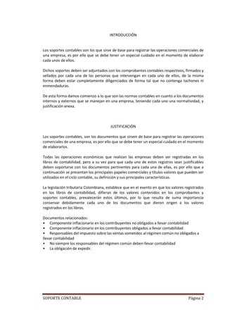 Este documento describe diferentes tipos de soportes contables utilizados en una empresa, incluyendo recibos de caja, comprobantes de consignación bancaria, facturas de venta, comprobantes de venta con tarjeta de crédito, cheques y comprobantes de pago. Explica los requisitos y propósitos de cada soporte contable.