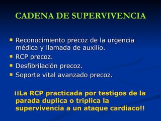 Este documento proporciona instrucciones sobre RCP básica. Explica que la RCP temprana realizada por testigos duplica o triplica la supervivencia de un ataque cardíaco. Detalla los pasos de la cadena de supervivencia que incluyen el reconocimiento temprano de la emergencia médica, la RCP temprana, la desfibrilación temprana y el soporte vital avanzado temprano. Luego explica en detalle cómo evaluar la escena, verificar la respuesta del paciente, abrir la vía aérea, comprobar