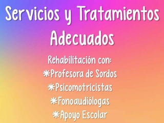El documento describe las características, tipología, consecuencias e intervenciones de la sordera. La sordera puede ser unilateral o bilateral, prelingüística o postlingüística, simétrica o asimétrica, gradual o repentina, fluctuante o estable y congénita o adquirida. Existen varias formas de clasificar la sordera según su localización, grado de pérdida auditiva, causas y edad de comienzo. La sordera puede tener consecuencias sociales, lingüísticas y académic