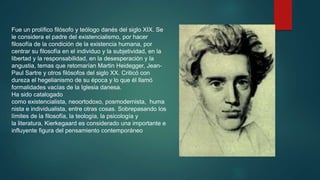 Søren Kierkegaard fue un filósofo danés del siglo XIX considerado el padre del existencialismo. Se centró en temas como la libertad individual, la angustia y la desesperación. Rompió su compromiso con su amada Regine Olsen, lo que influyó en gran parte de su obra. Escribió varios libros criticando el hegelianismo y la Iglesia danesa de su época. Se le ha catalogado de diferentes formas aunque él sobrepasaba los límites de la filosofía y otros campos.