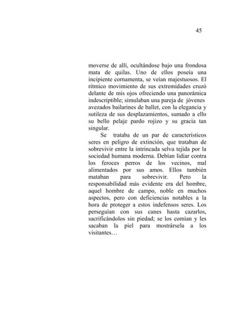 Este documento narra la experiencia del autor al avistar una pareja de pudúes en el bosque y su compromiso con los estudiantes de sensibilizar a la comunidad sobre la importancia de proteger a esta especie en peligro de extinción. A través de conversaciones en clase y actividades prácticas como dejarles comida, el autor y los estudiantes desarrollan un afecto por los pudúes y buscan cambiar las actitudes locales sobre cazarlos.