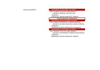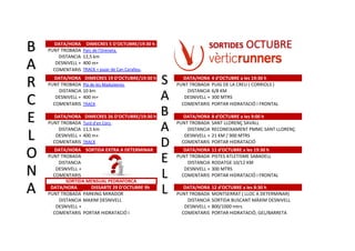 Este documento contiene la programación de varias salidas de ciclismo de montaña durante el mes de octubre, con fechas, puntos de encuentro, distancias, desniveles y comentarios para cada una. Se proporcionan detalles como la ruta, el equipamiento necesario como hidratación y frontal, y el objetivo de algunas salidas como buscar el máximo desnivel o entrenamiento pensando en la recuperación.