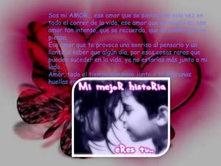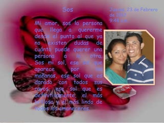 El documento es una carta de amor de 3 párrafos. En ella, el autor describe a su amada como la persona que lo ama más que nadie y como su sol que ilumina sus mañanas. Luego habla del amor que siente por ella como un amor único e intenso que se recuerda para siempre. Por último, expresa lo mucho que ha aprendido de ella y lo difícil que sería vivir sin su amor.